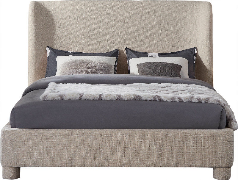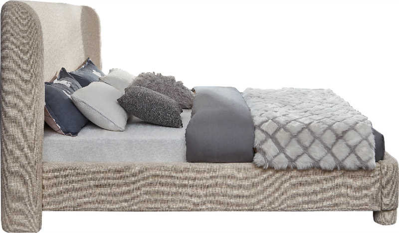 Rich Beige Linen Textured Fabric Mainly Beige Two Tone Fabric With White Weave Curved Headboard Fully Upholstered Bed Dimensions: 87" W x 88" D x 52" H