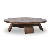 Made from character rich re-sawn oak, a simple, rounded coffee table features splayed legs for a hint of shapely intrigue. Overall Dimensions: 55.00"w x 55.00"d x 14.00"h