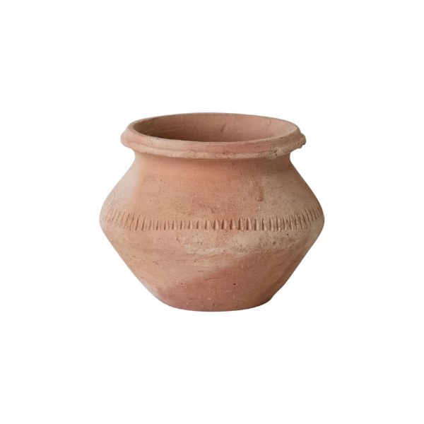 4-1/2" Round x 3-1/2"H 10 oz. Handmade Vintage Reproduction Terra-cotta Cup w/ Debossed Lines, Natural (Each One Will Vary)
