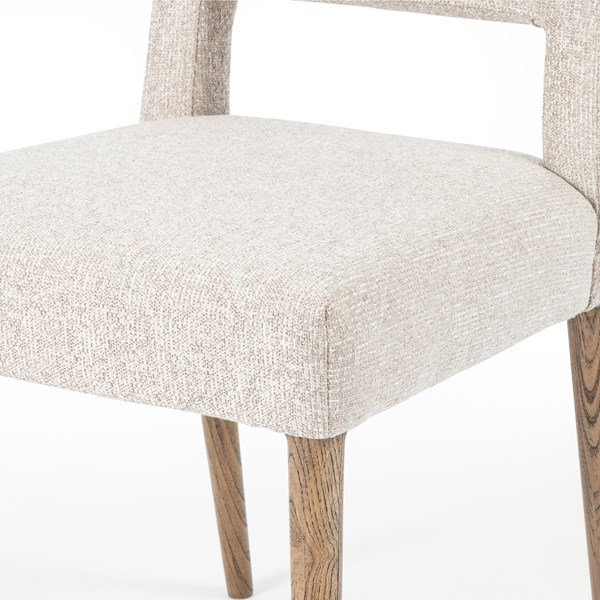 Simply styled and mid-century minded, textural light taupe upholstery features a posterior cutout for added flair, with toasted nettle-wood legs for natural contrast. Overall Dimensions: 18.75"w x 22.25"d x 32.00"h