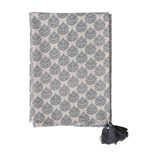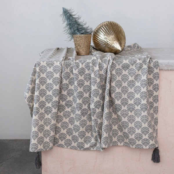 84"L x 60"W Cotton Printed Tablecloth w/ Leaf Pattern & Tassels, Natural, Grey & Gold